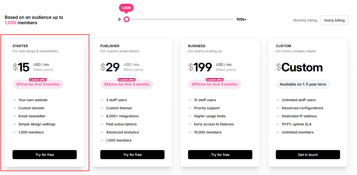 고스트 프로 유료 구독은 결정했지만, 그럼 Starter와 Publisher 중 어떤 플랜을 선택해야 할지가 고민이었습니다.