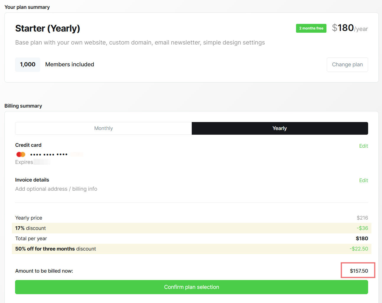 고스트프로는 연간 구독을 선택하면 2개월이 무료입니다. Starter 플랜의 경우 36달러를 할인받는 셈이죠. 여기에 Ghost 6.0 업그레이드 이벤트로 첫 3개월은 50% 할인이 적용되어 22.5달러를 추가로 절약할 수 있었습니다.