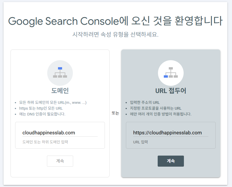 https://cloudhappinesslab.com)를 입력 후 '계속'을 누릅니다.