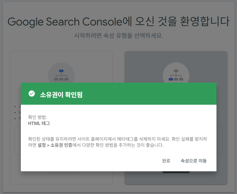- 다시 구글 서치 콘솔 화면으로 돌아와 '확인' 버튼을 누르면 소유권 확인이 완료됩니다.