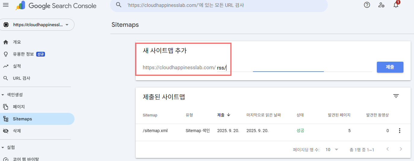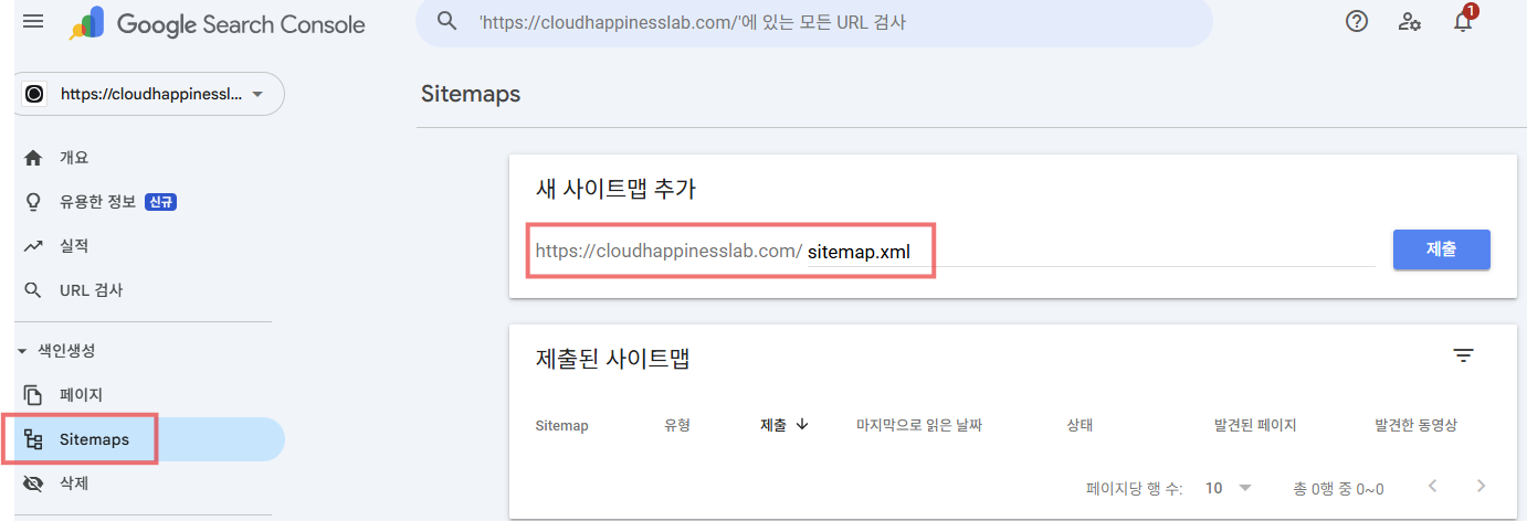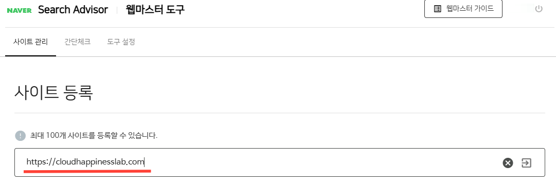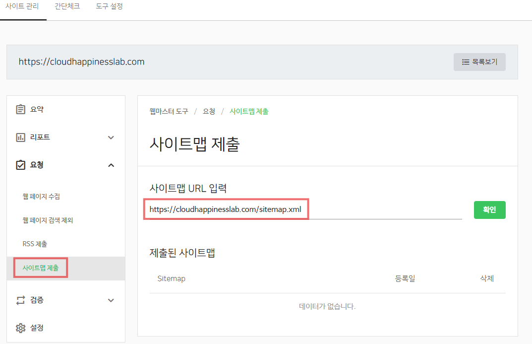 https://cloudhappinesslab.com/sitemap.xml)를 입력하고 '등록' 버튼을 누릅니다.