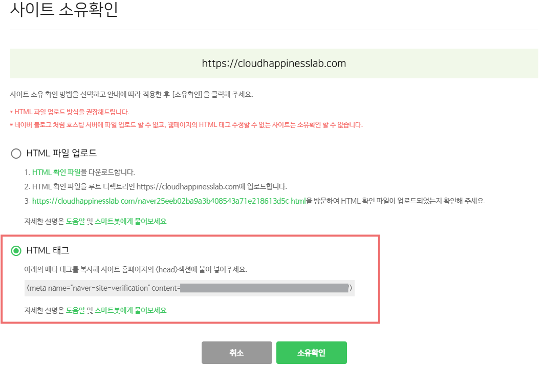- 소유권 확인 단계에서 'HTML 태그' 방식을 선택합니다.