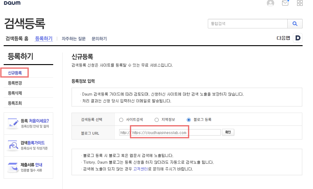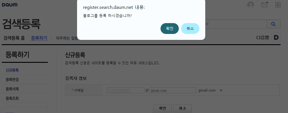 다음(Daum) 검색도 네이버와 비슷한 과정으로 등록합니다.