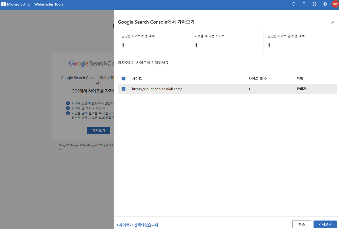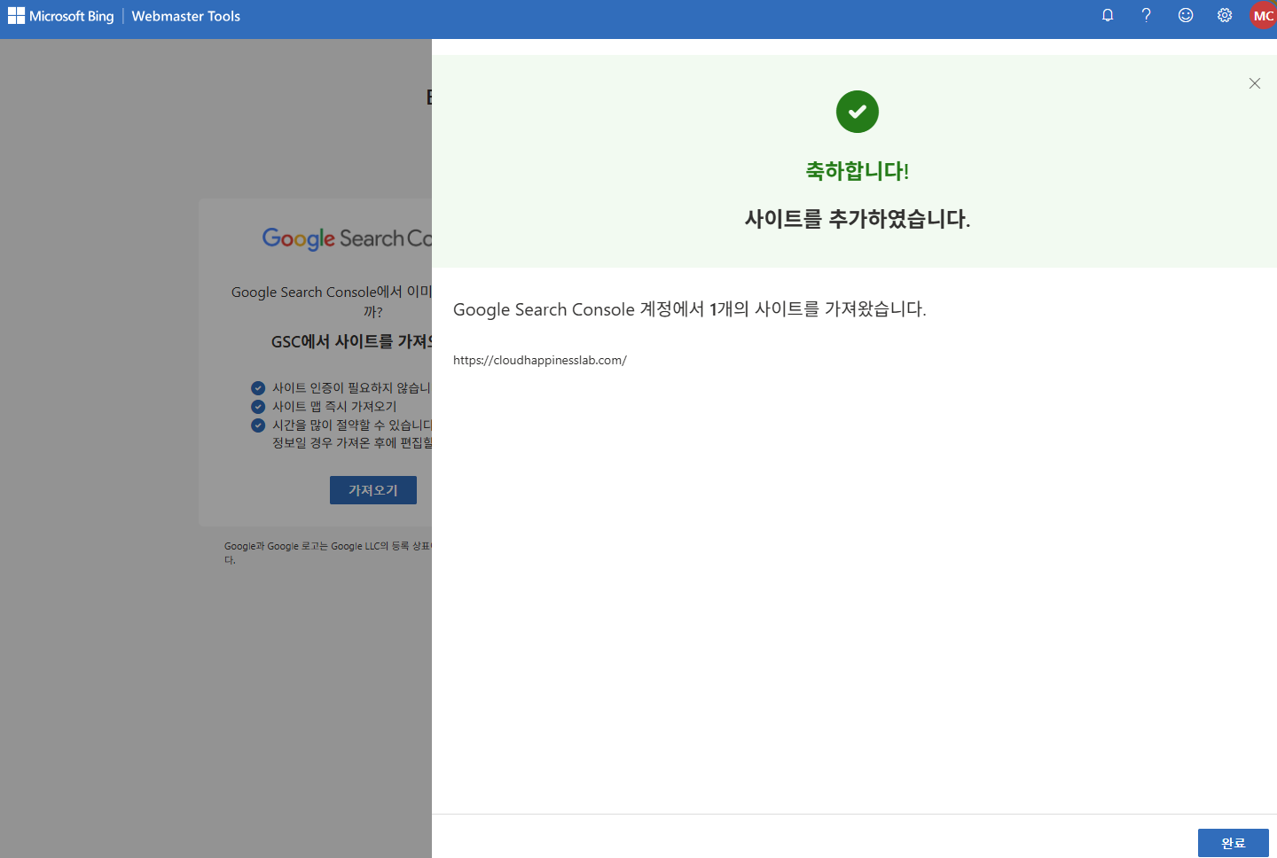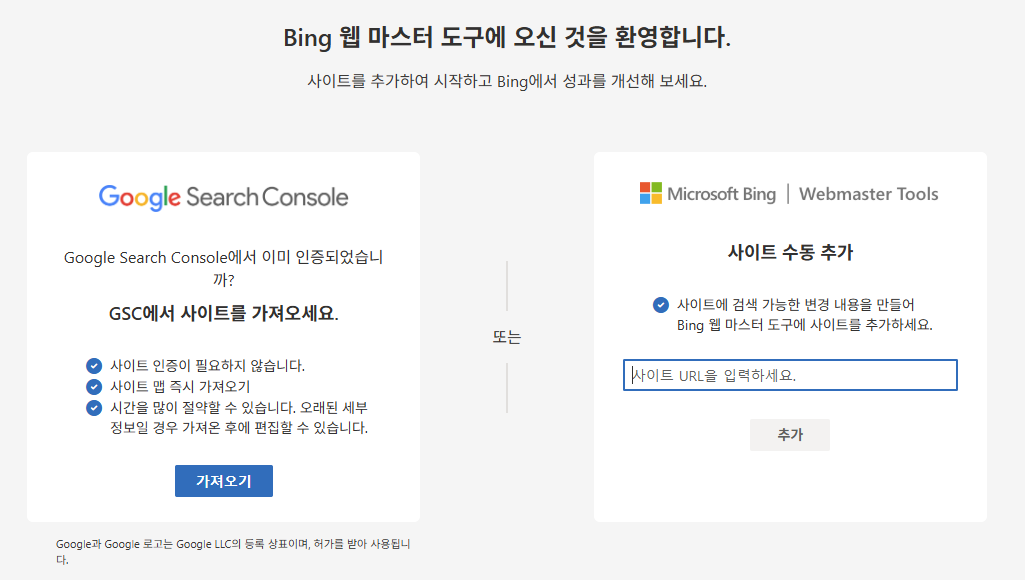 Bing 등록은 구글 서치 콘솔과 연동하면 1분 만에 끝납니다.