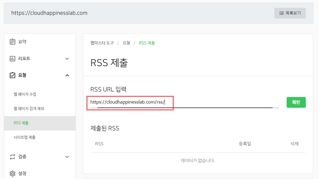 - 왼쪽 메뉴에서 '요청 > RSS 제출'을 클릭합니다.