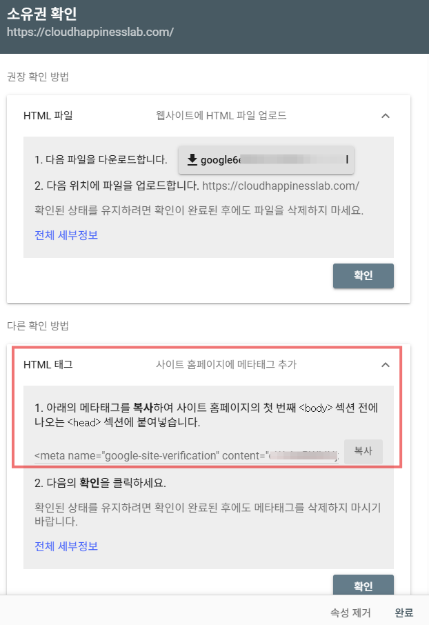- 사이트 소유 확인을 위해 제공되는 'HTML 태그'를 복사합니다.