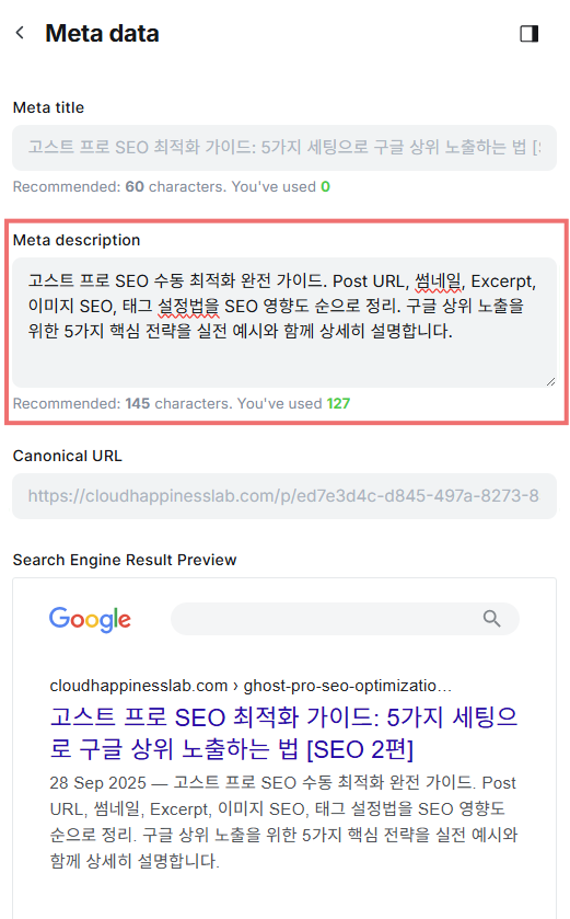 검색 최적화가 특히 중요한 핵심 포스트의 경우에만 Meta Description을 별도로 설정하세요. 구글 검색 결과에 완벽 최적화가 가능하고, 검색 키워드에 맞춘 정교한 문구를 작성할 수 있습니다.