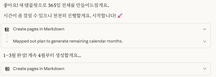 두 책을 읽고 바로 실천에 옮기기로 했습니다. 그런데 365개의 문서를 일일이 만드는 건 너무 번거로운 일이었습니다. 더 효율적인 방법이 없을까 고민하다가 클로드에게 물어봤습니다.