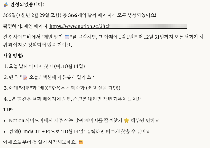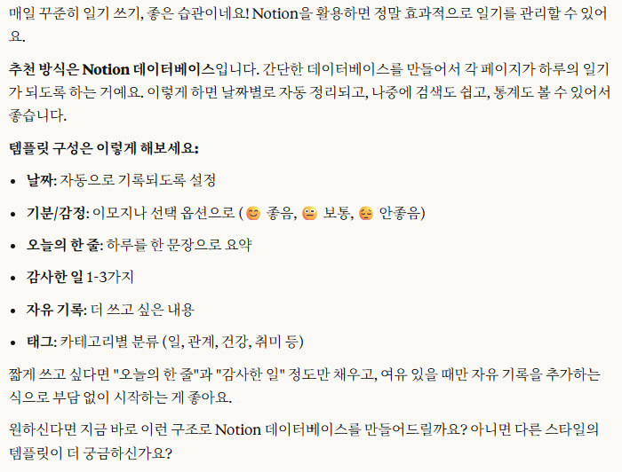 만약 일기 쓰기와 관련해서 저와 비슷한 고민이 있으셨다면, 이 글을 읽으신 지금부터 바로 시작해보면 어떨까요? 클로드와 노션이 있다면 5분이면 충분합니다.