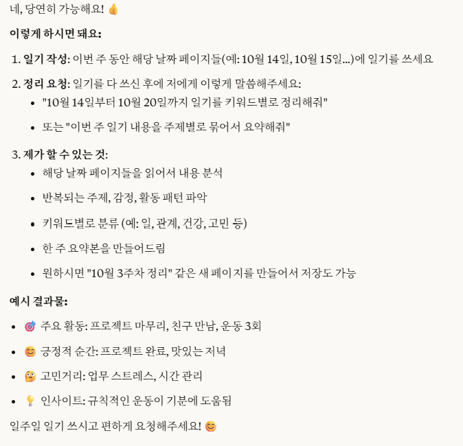 "내가 매일 노션에 일기를 쭉 쓰고, 한주, 한달, 1년간의 경험을 키워드별로 묶어서 정리하고 회고하는 걸 도와줄 수 있어?"
