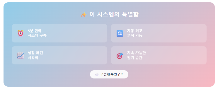 클로드 덕분에 일기를 쓰는 것에서 끝나는 게 아니라, 쌓인 일기를 분석하고 의미를 찾아내는 것까지 가능해졌습니다. 더 이상 단순한 일기가 아니라, 효율적인 회고 프로세스이자, 더 성장하고 나아가게끔 돕는 시스템으로 거듭났습니다.